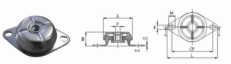 | 型號 | 橡膠硬度 IRHD (daN/mm) | A | B | P | F*M | CF | L | S | Average Stiffness平均值負荷(Kg/mm) | Max Load最大荷重(Kg) | Max Deflec.最大壓縮量(mm) |