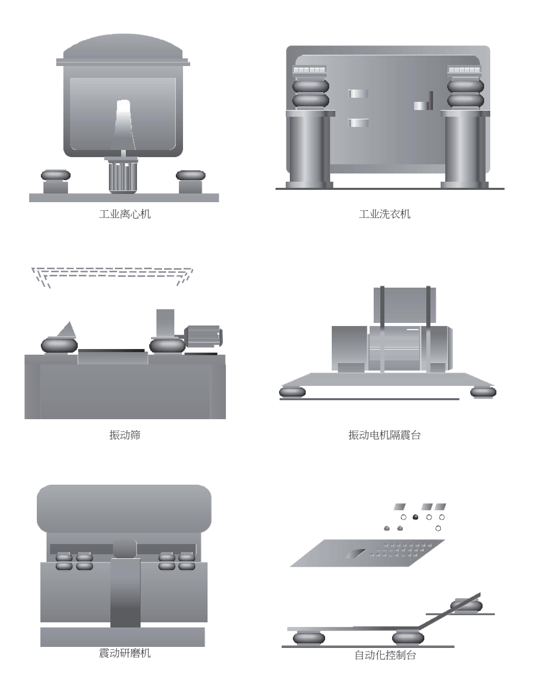 HF型活套式空氣彈簧、K型鎖扣式空氣彈簧、GF固定式空氣彈簧、ZF型自密封式空氣彈簧、JBF型卷邊式空氣彈簧、沖壓式法蘭空氣彈簧等等。